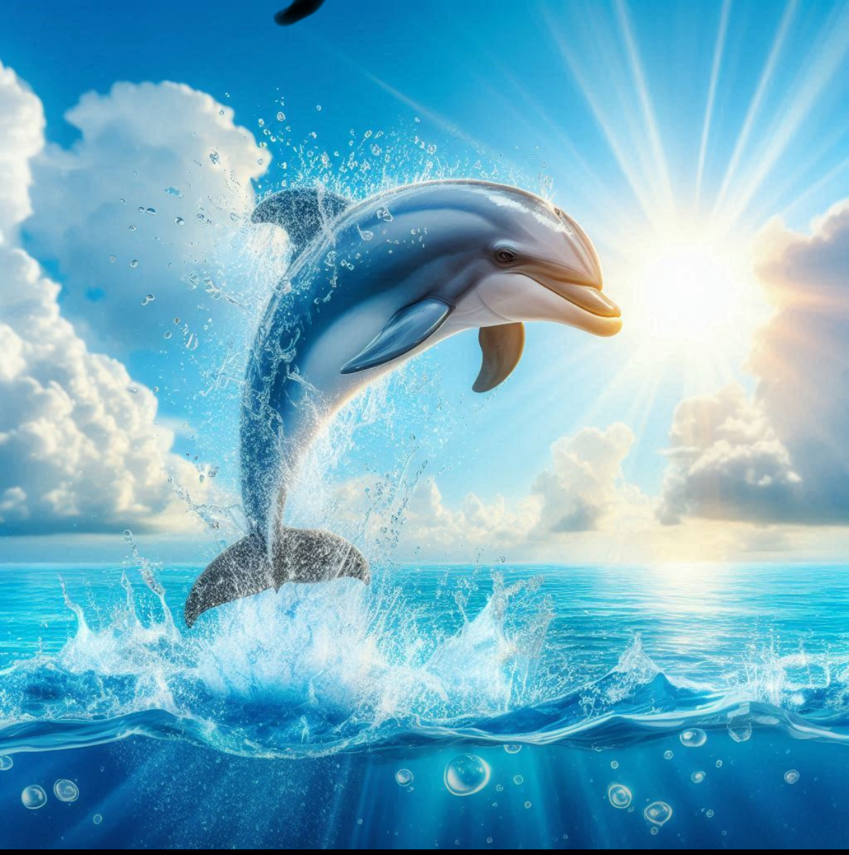 The dolphin is playing by jumping up onto the land in the sunshine and some small splashes come after it.