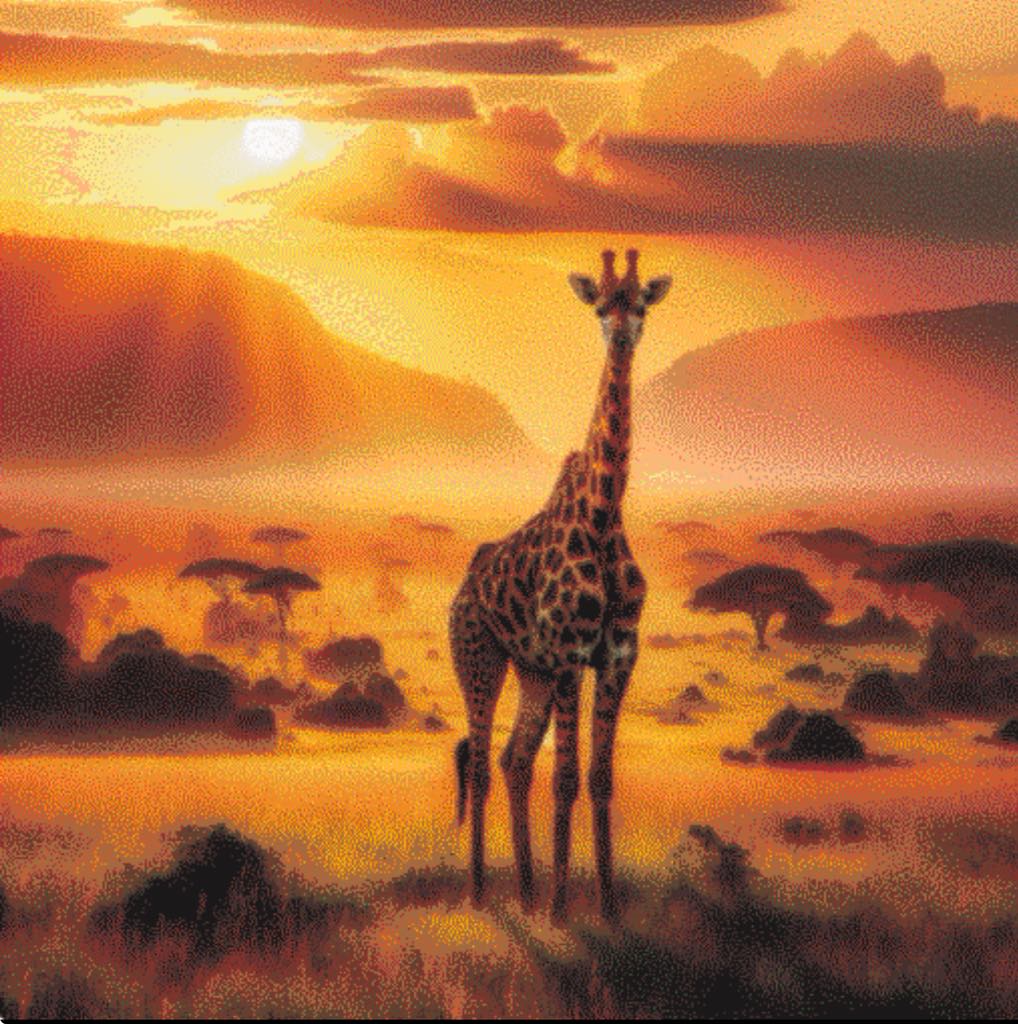 I centrum står en elegant giraffe, der bevæger sig yndefuldt gennem landskabet. Dens lange hals strækker sig mod horisonten, og dens smukke, plettede pels er gengivet med detaljer, der gør den utrolig livagtig. Giraffen fremstår som en del af savannens sjæl, dens rolige og opmærksomme væsen harmonerer med omgivelserne, som om den er en naturlig vogter af landskabet.
